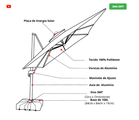 | Como limpar o ombrelone? | Utilize um pano úmido com sabão neutro para limpar o tecido e a estrutura. Evite produtos químicos agressivos para não comprometer o material. |